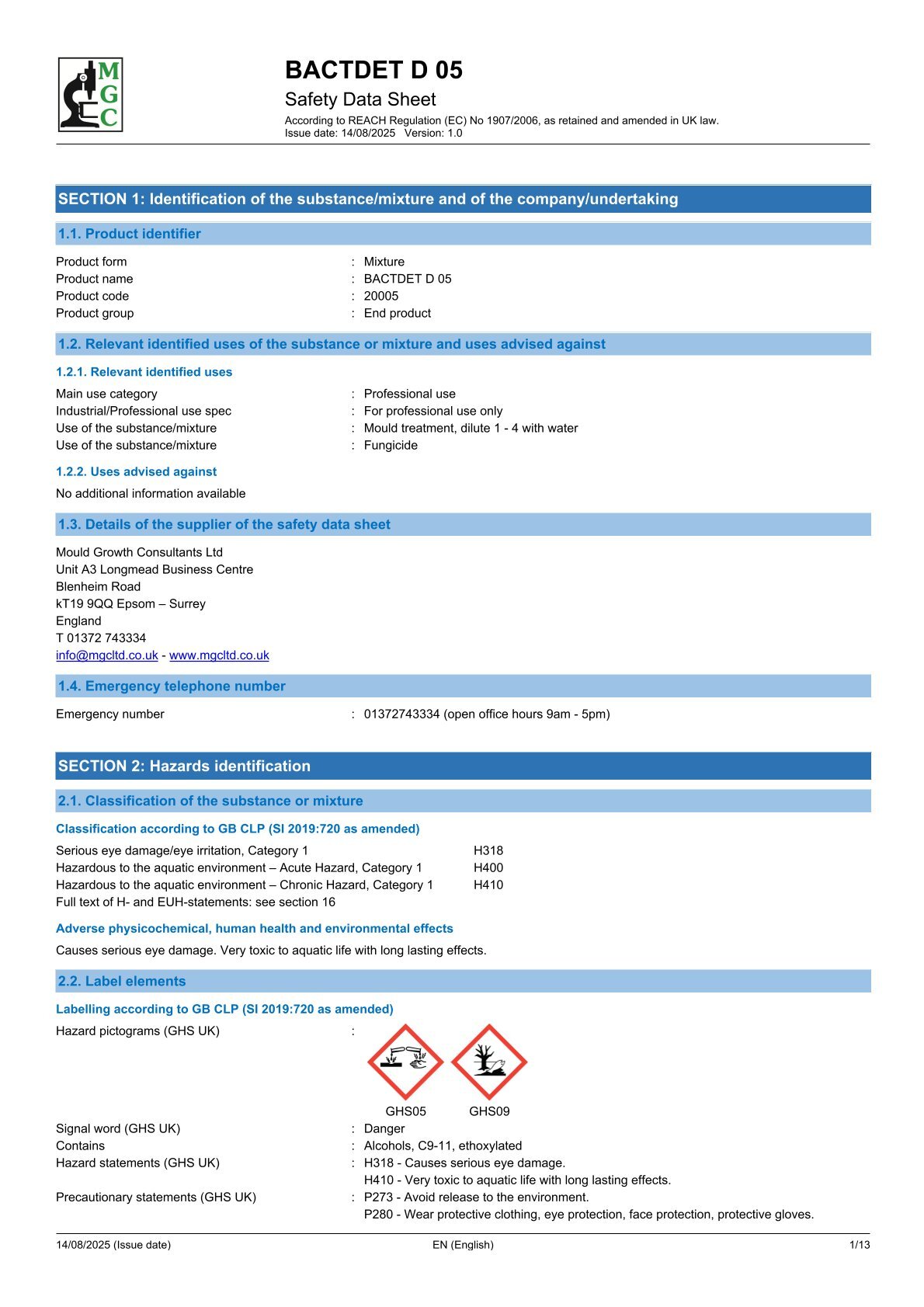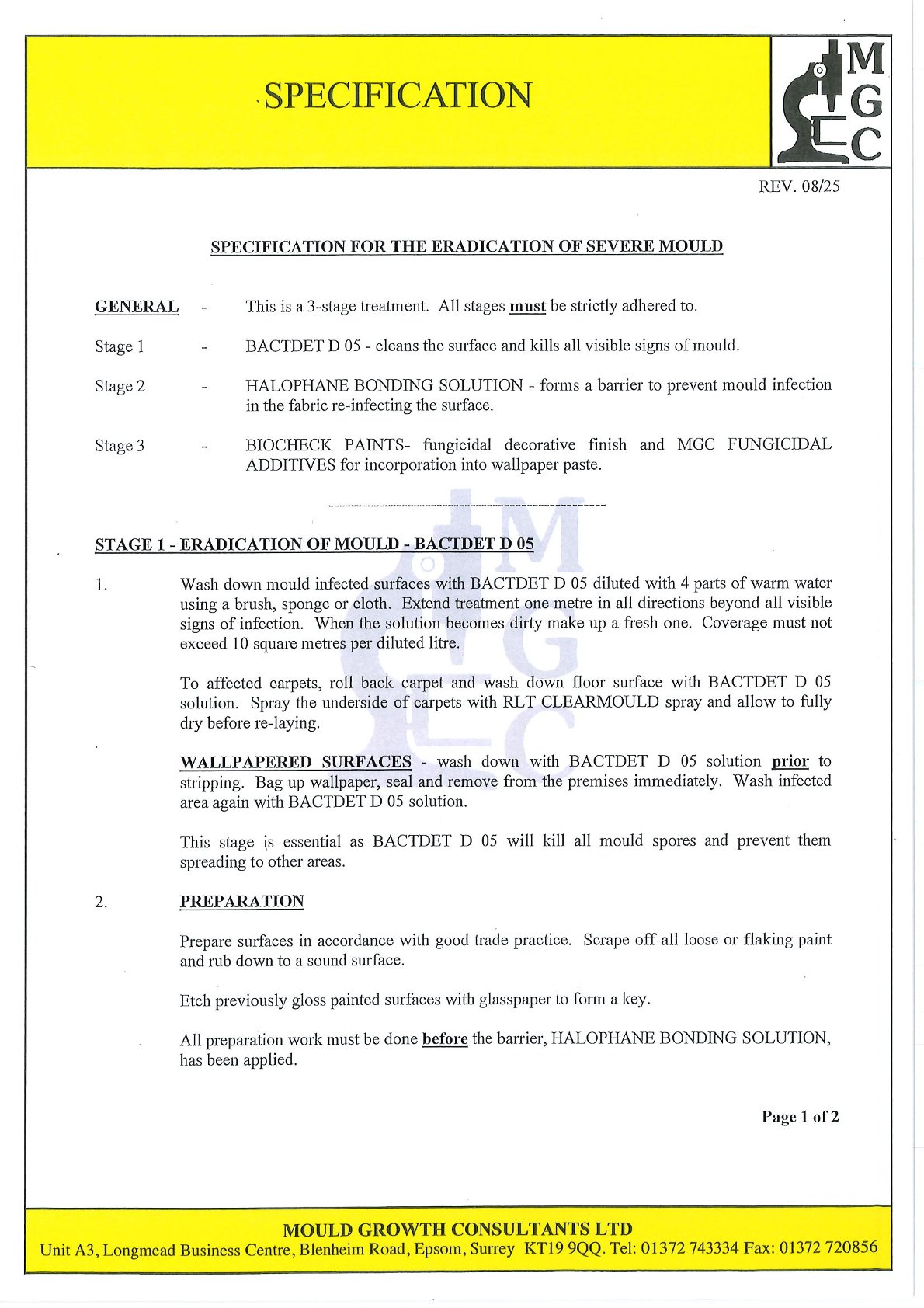 Wash down mould infected surfaces with BACTDET D 05 diluted with warm water using a brush, sponge or cloth. Extend treatment one metre in all directions beyond all visible signs of infection. When the solution becomes dirty make up a fresh one. Coverage must not exceed 10 square metres per diluted litre. Allow to dry.