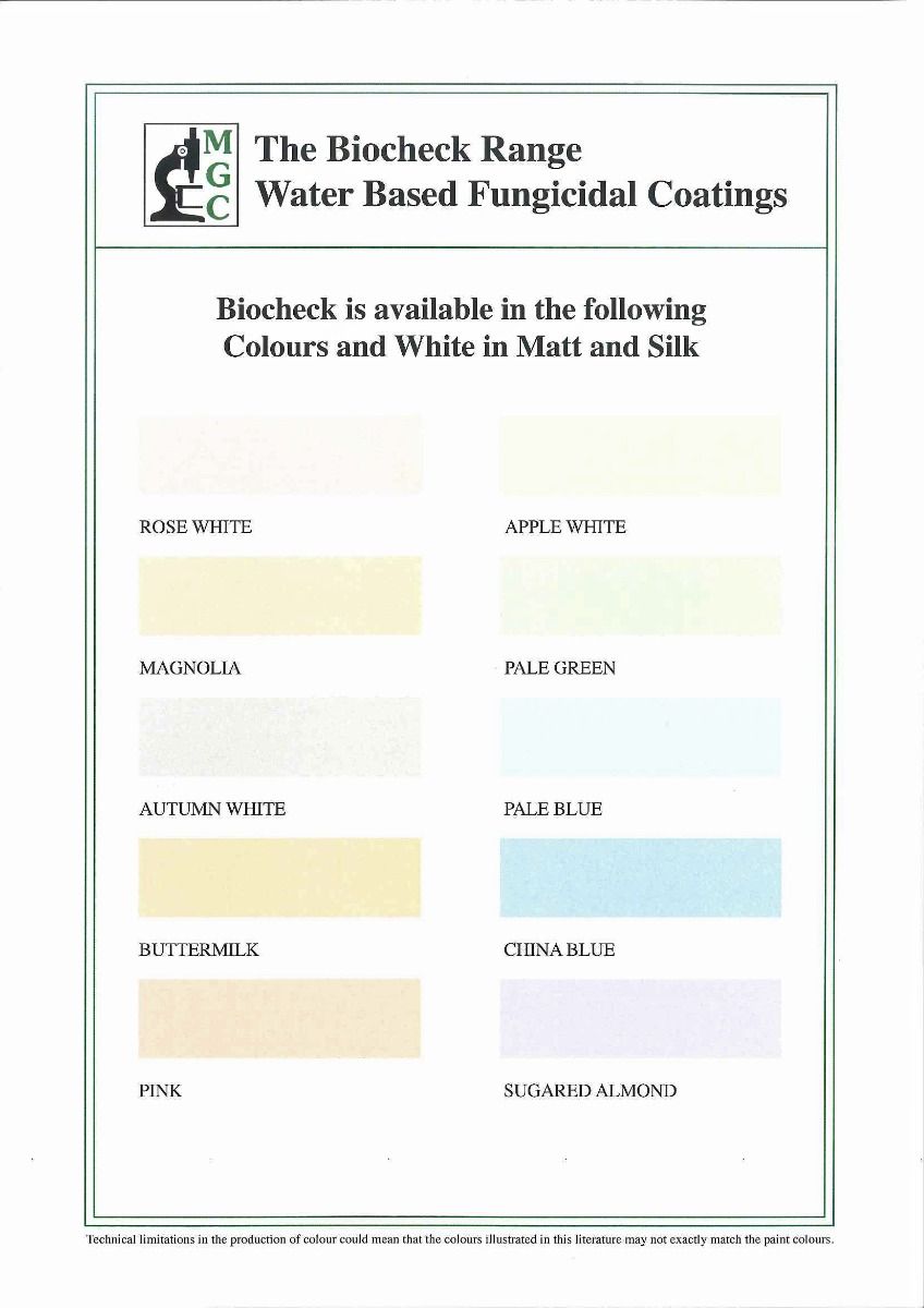 BioCheck Fungicidial Matt and Silk Emulsion has been tested by the Building Research Advisory Service and shown to be completely resistant to colonization and growth of mould and can be expected to perform well on surfaces prone to condensation.