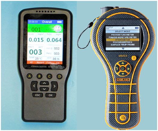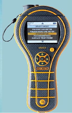 PROTIMETER MMS3 IDENTIFIES DAMP MOISTURE MEASUREMENT, PIN/NON INVASIVE, AMBIENT RELATIVE HUMIDITY AND TEMPERATURE MEASUREMENT, INFRARED NON CONTACT SURFACE TEMPERATURE, PSYCHROMETRIC CALCULATIONS.