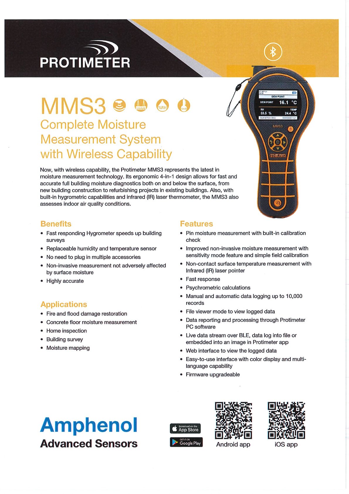 Now, with wireless capability, the Protimeter MMS3 represents the latest in moisture measurement technology. It's ergonomic 4-in-1 design allows for fast and accurate full building moisture diagnostics both on and below the surface, from new building construction to refurbishing projects in existing buildings. Also, with built-in hygrometric capabilities and infrared (IR) laser thermometer, the MMS3 also assesses indoor air quality conditions.