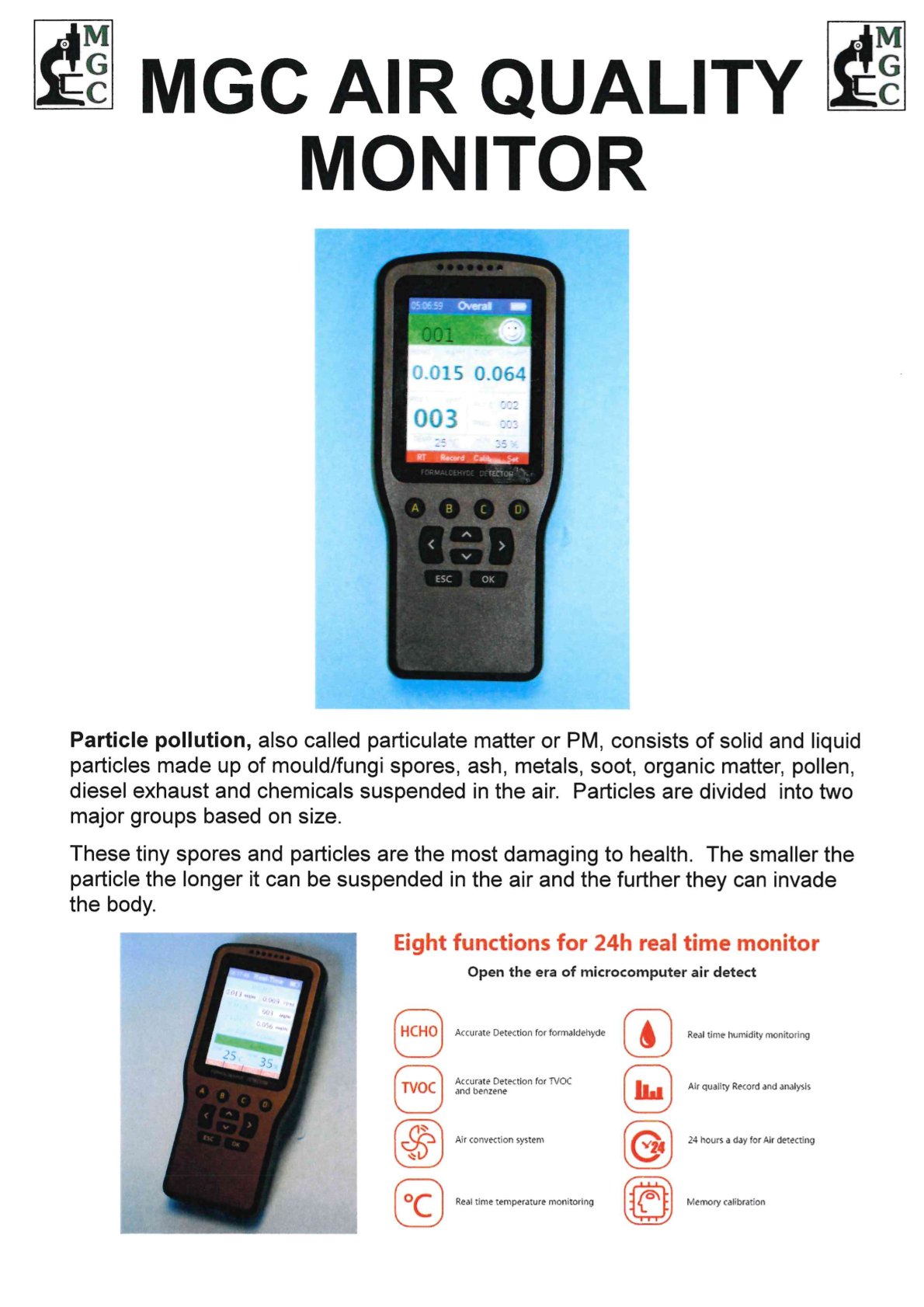 MGC Air QUality Monitor is designed to help identify the level of contaminates, particles and pollution in the air, both in the home and outside. The monitor measures particles in the atmosphere which consist of mould spores, fungi spores, pollen, dust, ash, soot, diesel exhaust, organic matter and chemicals suspended in the air. Particle polution, also called particulate matter or PM, consists of solid and liquid particles. Particles are divided into two major groups based on size. These tiny spores and particles are the most damaging to health. The smaller the particle the longer it can be suspended in the air and the further they can invade the body.