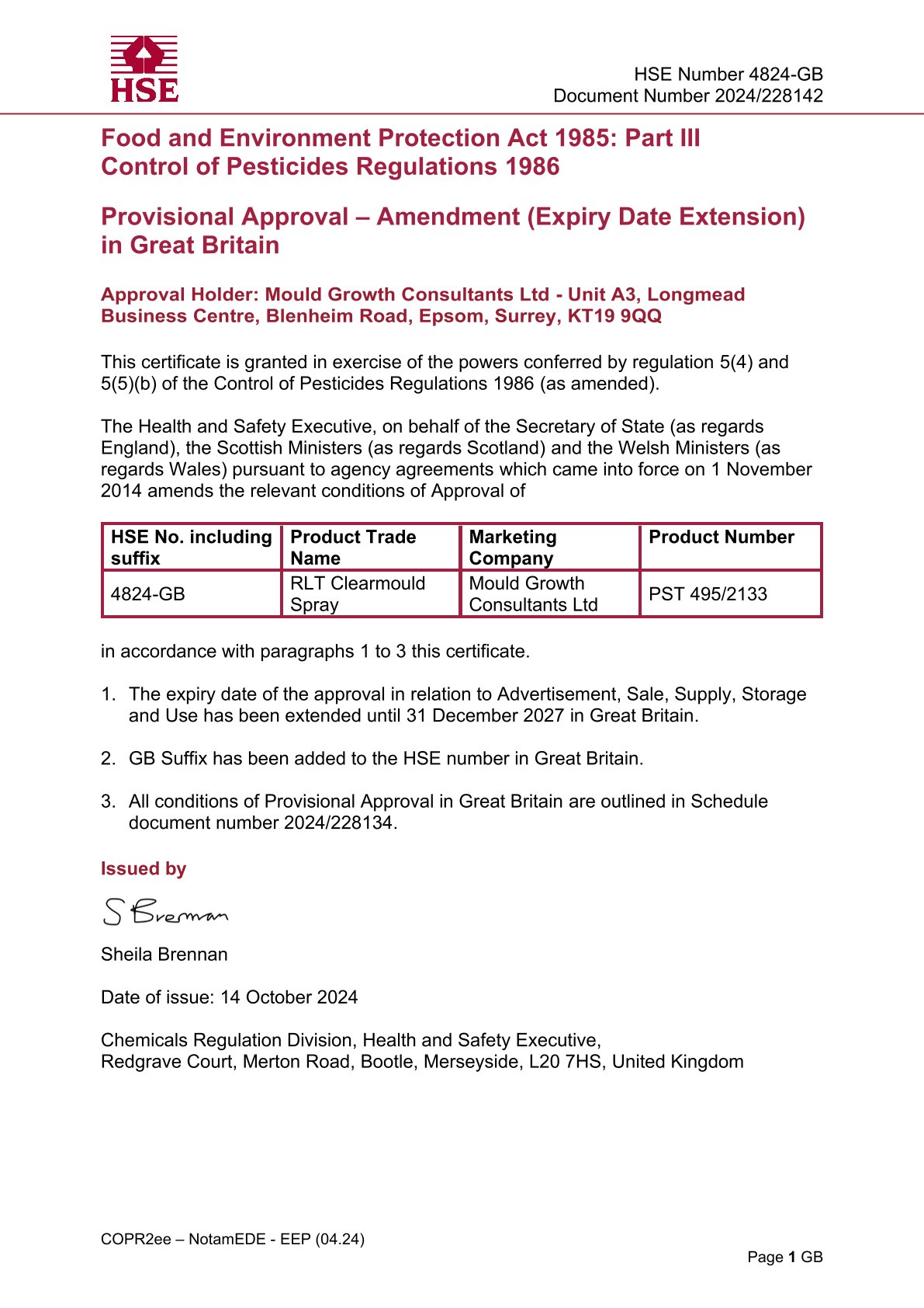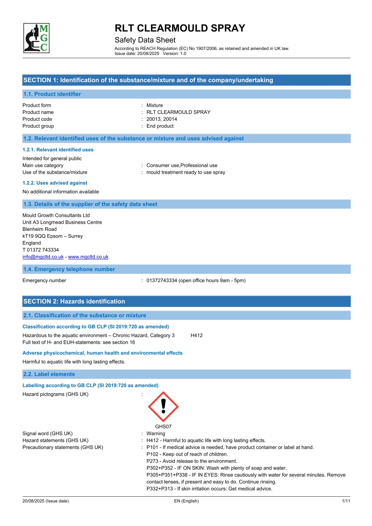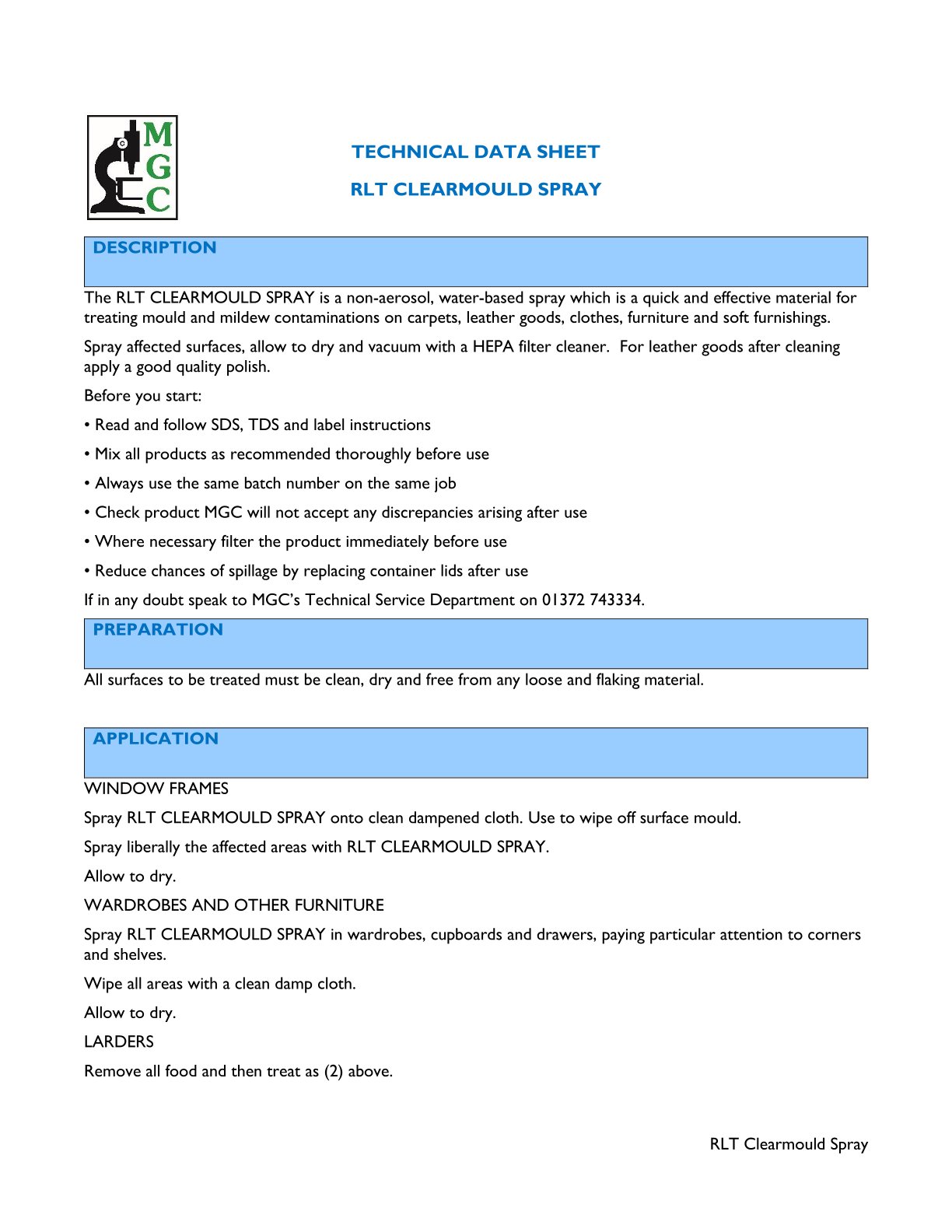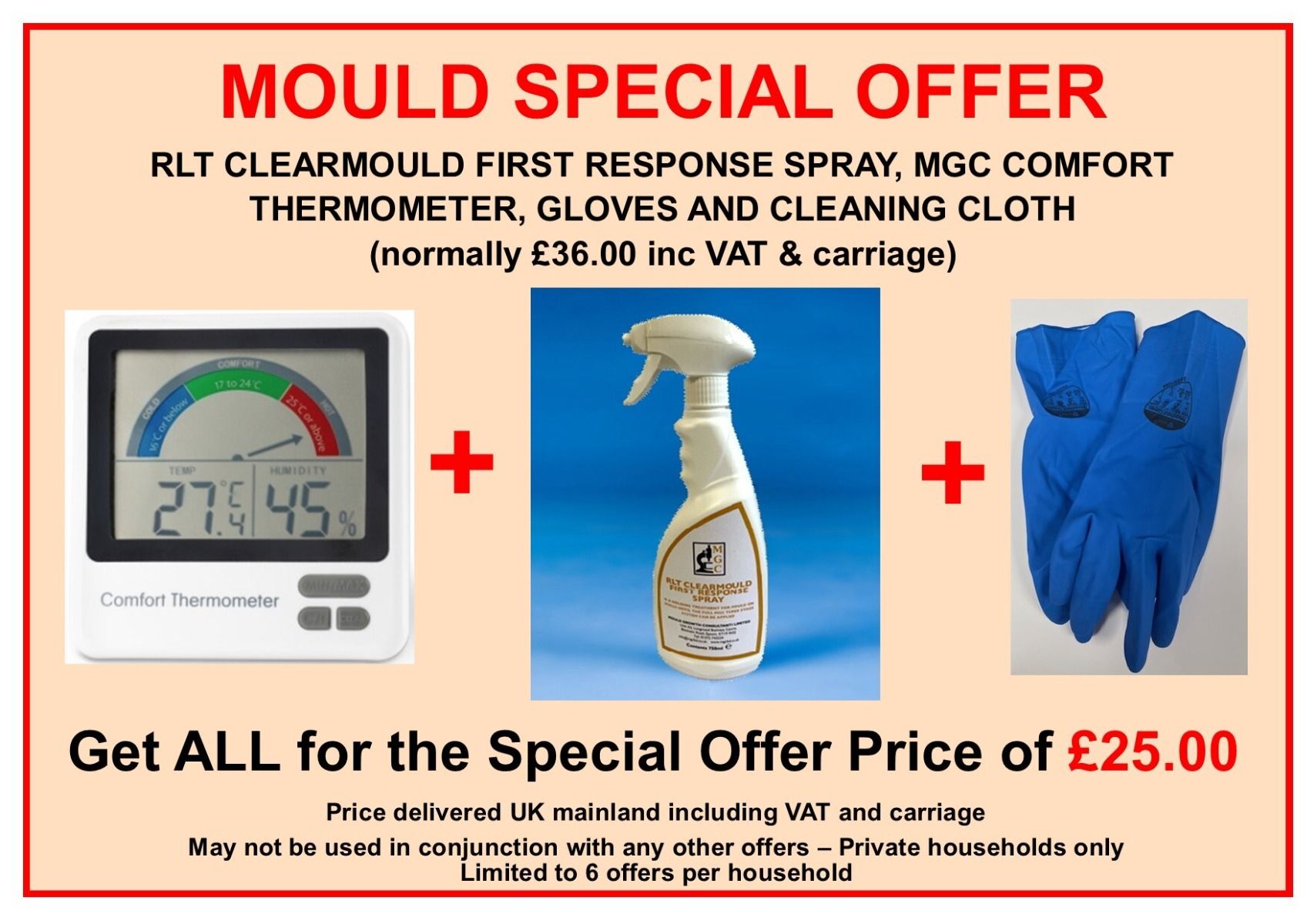 The RLT Clearmould First Response Spray will effectively kill surface mould spores but may not remove existing stains caused by mould.