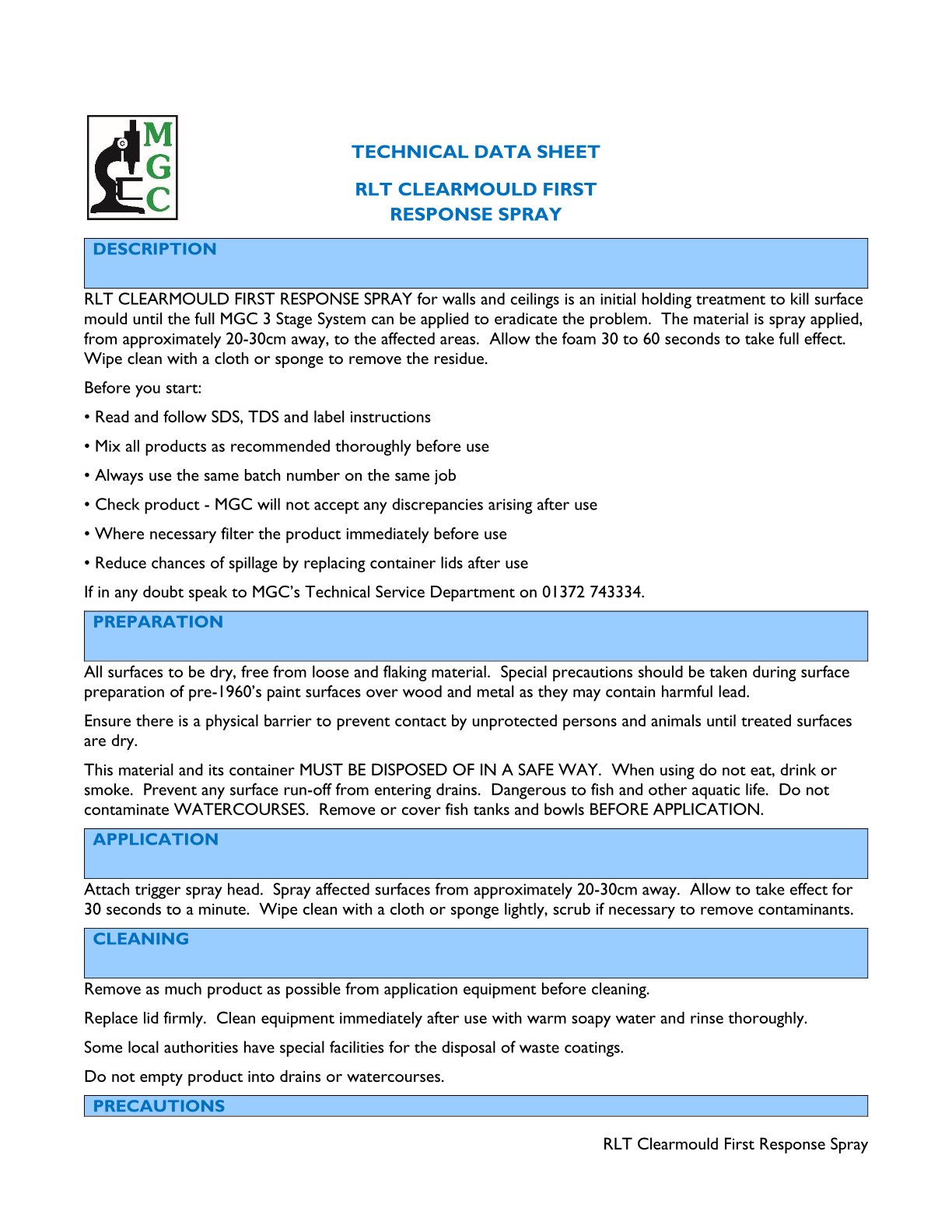RLT CLEARMOULD FIRST RESPONSE SPRAY for walls and ceilings is an initial holding treatment to kill surface mould until the full MGC 3 Stage System can be applied to eradicate the problem. The material is spray applied, from approximately 20-30cm away, to the affected areas. Allow the foam 30 to 60 seconds to take full effect. Wipe clean with a cloth or sponge to remove the residues. Whilst RLT CLEARMOULD FIRST RESPONSE SPRAY will effectively kill the surface mould spores, it will not necessarily remove the stain that the mould has created. The MGC 3 Stage treatment system when applied will eradicate mould issues and cover any surface stains.
