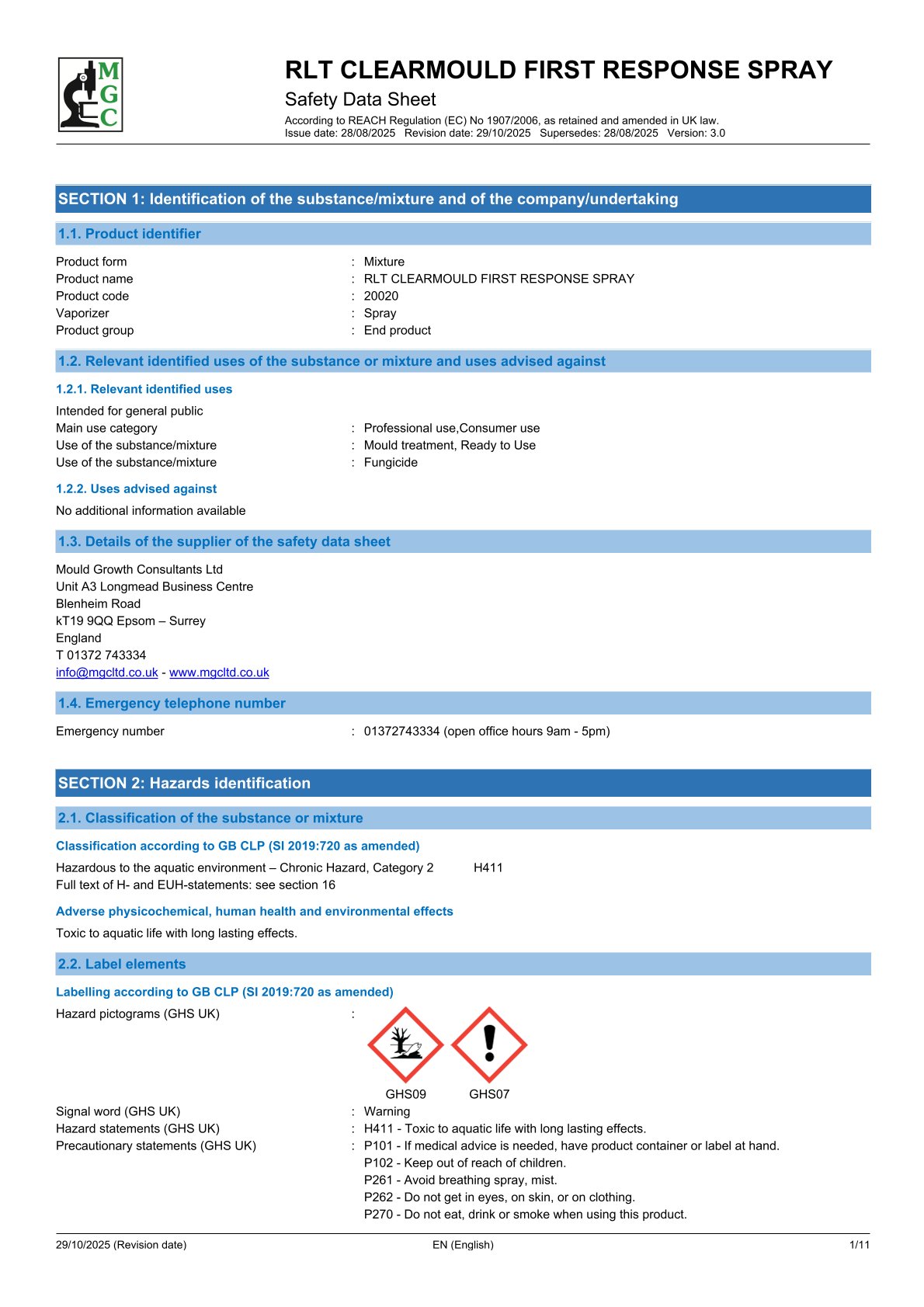 ✓ Constrains mould problem until full MGC 3 Stage treatment is applied